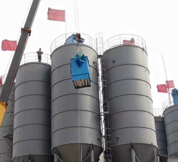 倉頂除塵器是一種方形可拆的金屬柜,底板上有24個嵌入圓形孔,它設有24條濾袋,分三組(每組8個)分別扎緊在上端3個振動器的吊架上,定時分別拉動三組吊架的牽動手柄,使濾袋阻留下來的灰塵降落在倉頂除塵器的方形金屬下端的料倉內(nèi)。