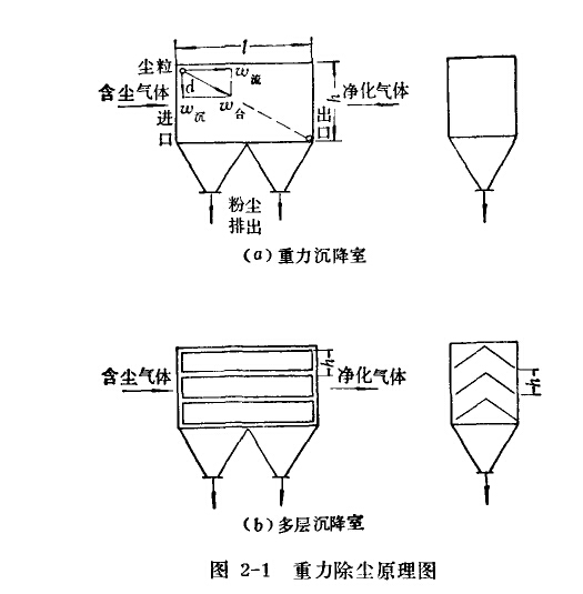 圖為重力除塵原理圖。w為粉塵的沉降速度,粉塵顆粒直徑越大沉降速度越快,粉塵密度越大沉降速度也越快。w為粉塵隨氣流流動(dòng)的速度。粉塵實(shí)際流動(dòng)的速度為w。如果直徑為d的粉塵穎粒進(jìn)入沉降室(如圖所示的位置),當(dāng)它到達(dá)沉降室出口時(shí),正好沉降到底部,就被收了下來(lái)。很明顯,直徑小于d的粉塵顆粒由于沉降速度慢,還未沉到沉降室底部,就在出口處隨氣流跑了,收不下來(lái),直徑大于d的粉塵穎粒由于沉降速度快,還未到達(dá)出口處就已沉降到沉降室底部。由此可見(jiàn),密度相同的粉塵,直徑大的顆粒沉降在靠近進(jìn)口端處;直徑小的顆粒沉降在靠近出口端處。