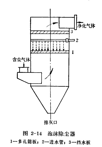 泡沫除塵器是一種清洗式除塵設(shè)備,如圖所示。含塵氣體由底部進(jìn)入筒體,由于慣性力的作用,較大粗穎粒落入筒底。當(dāng)含塵氣體通過(guò)多孔篩板時(shí),一與篩板上面的水接觸,形成擾動(dòng)較大的泡沫層,泡沫層就使含塵氣體和液體的接觸面大大增加,借此達(dá)到氣體水浴的目的,清洗氣體的污水經(jīng)除塵器底部的錐體排出。為了防止清洗后氣體將水滴帶到除塵器管道中,除塵器筒體上部設(shè)有擋水板。