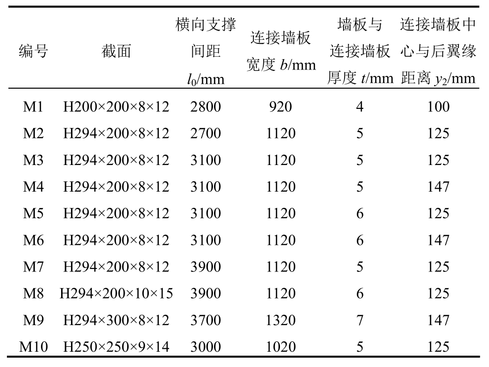 依據(jù)實(shí)際中常規(guī)的除塵器殼體結(jié)構(gòu)幾何參數(shù),設(shè)計(jì)了10例基礎(chǔ)研究模型,幾何參數(shù)如表1所示。這些模型涵蓋了大型、中型、小型除塵器的幾何尺寸,確保研究結(jié)果具有普遍性。實(shí)際除塵器一般布置有多跨圍護(hù)墻板,以保證收塵效果。為簡(jiǎn)化模型,提高計(jì)算效率,僅取兩跨墻板建模。中間雙肢組合柱截面如圖1(b)所示。H型鋼柱與墻板直接相連的一側(cè)翼緣稱為后翼緣,不受墻板約束的立柱翼緣稱為前翼緣。連接墻板與兩肢立柱的腹板通過焊接連接。立柱總高度H,橫向支撐間距l(xiāng)0 (即連接槽鋼間距,亦為單肢立柱繞y軸的計(jì)算長(zhǎng)度),殼體墻板寬度w,連接墻板寬度b,墻板與連接墻板壁厚t,連接墻板中心與后翼緣距離y2。