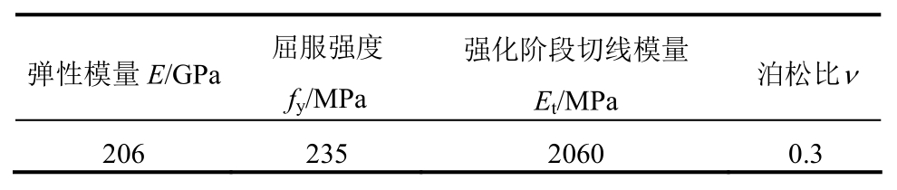 采用ANSYS有限元程序進(jìn)行數(shù)值分析,選用Shell181單元對(duì)所有結(jié)構(gòu)構(gòu)件進(jìn)行模擬。材料參數(shù)如表2所示。鋼材本構(gòu)采用雙線性等向強(qiáng)化模型,以米賽斯準(zhǔn)則判斷是否發(fā)生屈服。考慮幾何非線性影響,采用弧長(zhǎng)法跟蹤結(jié)構(gòu)響應(yīng)路徑。