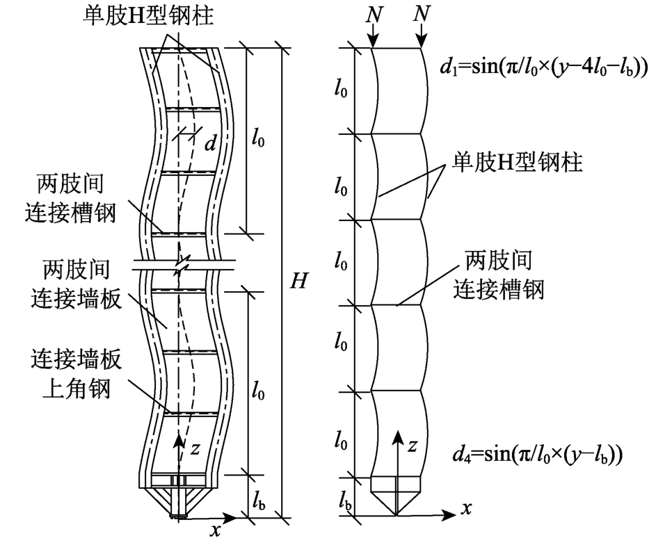 基于這樣的推斷,建模時(shí)首先對(duì)中間兩肢H型鋼柱在各連接槽鋼區(qū)間(連接槽鋼可視作H型鋼柱的側(cè)向支撐)構(gòu)造了繞y軸的正弦半波形式初始幾何缺陷,形成初始彎曲變形,缺陷形式如圖3所示。缺陷幅值δ取千分之一柱高。