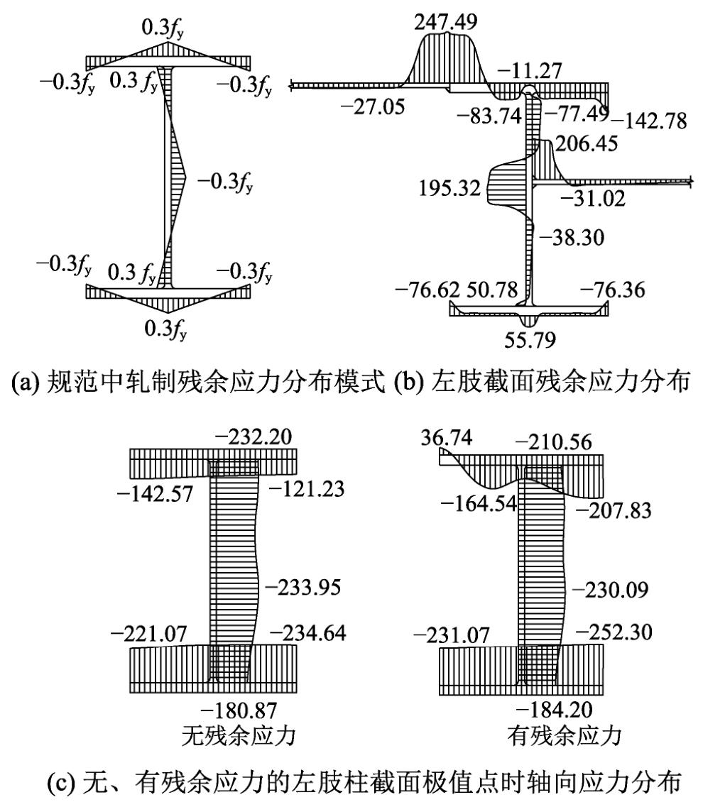 為考察殘余應(yīng)力對(duì)立柱軸壓承載能力的定量影響,將利用實(shí)體單元進(jìn)行軋制與焊接過程模擬形成的殘余應(yīng)力分布簡(jiǎn)化后引入殼單元構(gòu)建的結(jié)構(gòu)體系有限元模型進(jìn)行非線性計(jì)算,計(jì)算結(jié)構(gòu)在有、無殘余應(yīng)力時(shí)的穩(wěn)定承載力。對(duì)于不同構(gòu)造與尺寸的模型M1和M5,考慮殘余應(yīng)力后的穩(wěn)定承載力分別為未考慮殘余應(yīng)力的0.971倍與0.989倍,減小幅度均不超過5%。同一截面上,無、有殘余應(yīng)力情況左肢立柱截面達(dá)到極限承載力時(shí)的軸向應(yīng)力分布如圖4(c)所示。立柱的失穩(wěn)主要體現(xiàn)為前半部分截面的失穩(wěn),在無殘余應(yīng)力情況荷載達(dá)到極值時(shí),腹板與前翼緣組成截面的壓應(yīng)力分布較為均勻,基本接近全截面屈服的水平。殘余壓應(yīng)力的存在可能會(huì)透支一定前半部分截面應(yīng)力增加空間,但圖4(b)表明,多步加工使得前腹板與前翼緣上的殘余拉、壓應(yīng)力分布基本平衡,殘余應(yīng)力引起初始軸向內(nèi)力合量不超過該部分截面屈服荷載的5%。圖4(c)表明,有、無殘余應(yīng)力情況最終發(fā)生破壞時(shí)的立柱截面軸向應(yīng)力分布差異不大,有殘余應(yīng)力時(shí)前翼緣的壓應(yīng)力水平更高一些。在有、無殘余應(yīng)力時(shí),分別對(duì)H型鋼前半部分截面軸向加載階段計(jì)算應(yīng)力增量積分(即前半部分截面的軸向內(nèi)力加載量),繼而求出比值,M1模型有、無殘余應(yīng)力情況軸力增量比值為0.983,M5模型有、無殘余應(yīng)力情況軸力增量比值為0.982??梢姡捎谝子诎l(fā)生失穩(wěn)的H型鋼前半部分截面殘余應(yīng)力基本平衡,且達(dá)到極限承載力時(shí)截面處在一個(gè)較為均勻的高壓應(yīng)力水平,因此殘余應(yīng)力的影響不大??紤]到由于殘余應(yīng)力的存在立柱承載力減小幅度不超過5%,且這種影響對(duì)于不同構(gòu)造立柱差異不大,因此,為簡(jiǎn)化計(jì)算,后續(xù)有限元模型中不再引入殘余應(yīng)力,而用一個(gè)偏于安全的折減系數(shù)來反映殘余應(yīng)力的不利影響。