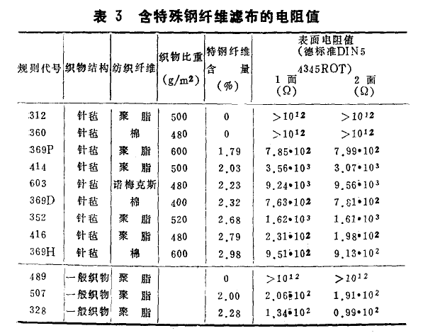 表3列出了各種含特殊綱纖維或不含特殊鋼纖維濾料的表面電阻值,該值是根據(jù)德國工業(yè)標(biāo)準(zhǔn)54345測(cè)定的.不同面積比重的織物纖維制成的濾料結(jié)構(gòu),加入不銹鋼纖維后,使其電阻值保持在很低的水平.當(dāng)特殊鋼纖維含量約占2%時(shí),無論使用什么織物纖維或?yàn)V料結(jié)構(gòu),表面電阻都在102-102電阻之間.該值低于波恩職業(yè)協(xié)會(huì)確定的109電阻安全限值.