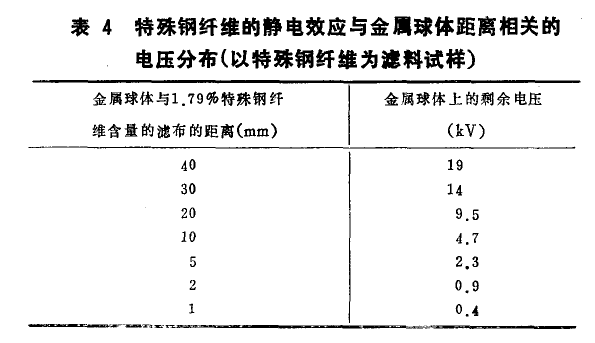 表4明確說明了金屬球體臨近濾料不同距離時(shí)的剩余電壓,由于特鋼纖維的電弧放電效應(yīng),電壓幾乎降至0.