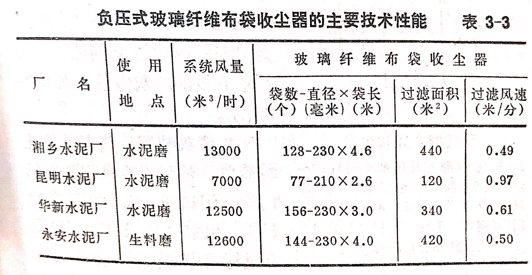 一些廠負(fù)壓式玻璃纖維布袋收塵器的主要技術(shù)性能列于表3-3.